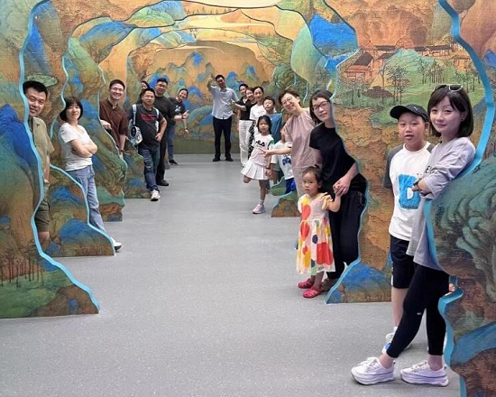 “画游千里江山——故宫沉浸艺术展”以《千里江山图》为创作原型,融入了吴江地方元素,以及古画中的一些元素,结合现代科技,场馆像动起来的古画。职工亲友们走进《千里江山图》,感受沉浸式东方美学的极致魅力,回味上下五千年笔墨精妙。小朋友亲手为动物们填上色彩,通过扫描的画也将成为屏幕投影的一部分。